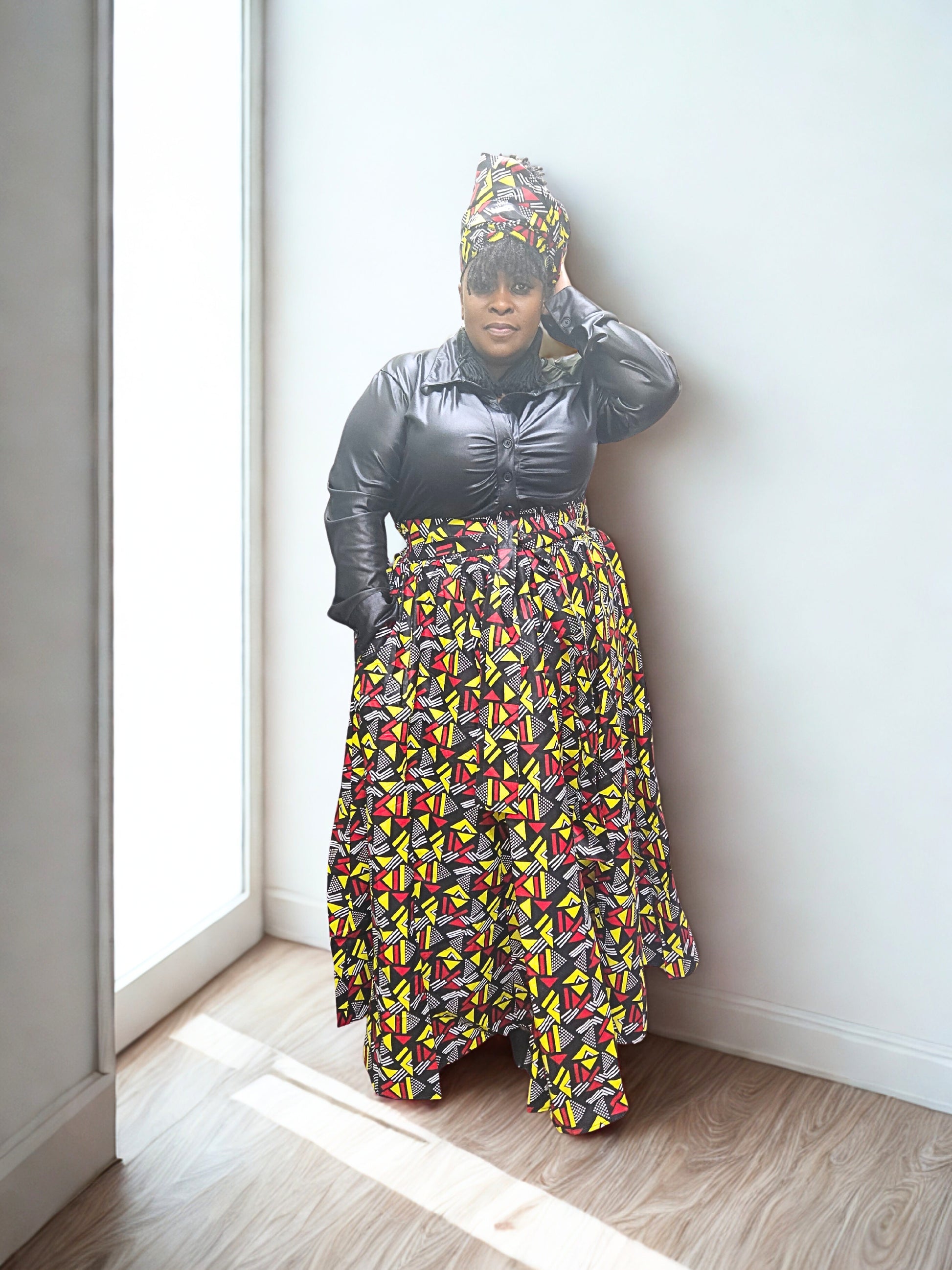 Celebrate the beauty, strength, and creativity of our roots with the Heritage Harmony Maxi Skirt — a stunning piece from our Motherland Collection, honoring Black History Month. Crafted from bold African-inspired Ankara print, this skirt bursts with radiant tones of red, yellow, black, and white — each shape and line symbolizing unity, pride, and resilience. The full, flowy silhouette moves gracefully as you walk, while the matching sash offers versatile styling for a perfect fit every time. Whether worn for cultural celebrations, special occasions, or everyday empowerment, this skirt is more than fashion — it’s a statement of heritage, history, and heart.